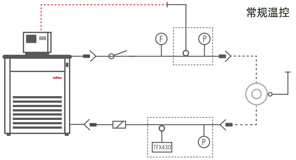 系统组成: JULABO 温控系统管路, 快插接头, 三通阀,手动阀门, M+R 温 度传感器,流量计,过滤器,压力表